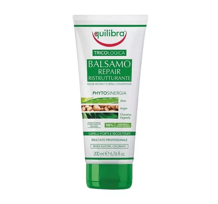 Equilibra Tricologica Balsamo Repair Ristrutturante - це кондиціонер, рекомендований спеціально для пошкодженого, делікатного, ламкого та тьмяного волосся. Його формула містить екстракт кінського каштана, який зміцнює структуру волосся, живить його і відновлює пасма. Природні зволожувачі, що входять до складу кондиціонера, полегшують розчісування волосся. 98% косметичних компонентів мають природне походження. Після застосування відновлювального кондиціонера Ваше волосся стане міцним, гладким, м’яким на дотик і сповненим природного блиску!
