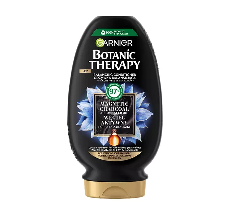 Кондиціонер для сухого волосся Garnier Botanic Therapy Magnetic Charcoal створений на основі цінних інгредієнтів, серед яких очищаюче активоване вугілля та зволожуюча олія чорного кмину. Кремова текстура бальзаму ніжно обволікає пасма, додаючи бажані живильні речовини, не обтяжуючи їх. Формула гіпоалергенна (підтверджено сертифікатом ECARF), Ви не знайдете в ній силіконів і парабенів. Достатньо кількох хвилин з Magnetic Charcoal, щоб правильно закрити вологу в кутикулі волосся - до 72 годин.