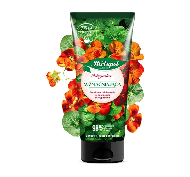 Зміцнюючий кондиціонер Хінне дерево & Настурція & Лопух Herbapol є веганським. Додатковою перевагою є приємний аромат, який робить застосування більш комфортним.