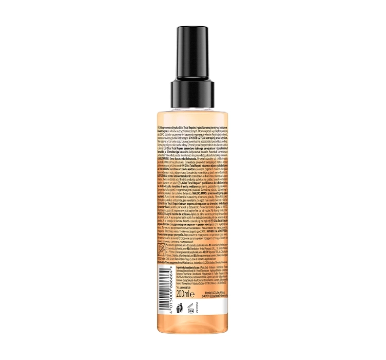 Експрес-кондиціонер для волосся Total Repair містить гідролізований креатин і квітковий нектар, які глибоко проникають у структуру волосся, ідеально регенеруючи - навіть до 90% менше пошкодженого волосся. Завдяки такій вдосконаленій формулі, засіб миттєво зміцнює і захищає волосся від негативного впливу зовнішніх факторів та засобів для укладання. Волосся стає менш ламке, посічене і здоровіше. Крім того, продукт інтенсивно живить, роблячи його м’якими, еластичним та блискучими. Додатково засіб містить понад 90% натуральних складників, а невелика упаковка з атомайзером дозволяє легко наносити продукт, і Ви завжди можете мати її у себе в сумці або під час подорожі, а також вона виготовлена з 50% переробленого ПЕТ .