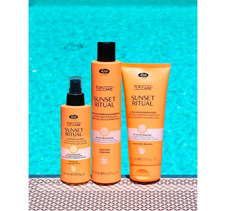 Lisap Milano Top Care Sunset Ritual — професійна колекція косметики для догляду за волоссям і тілом після засмаги. Серія Sunset Ritual створена для відновлення та освіження волосся та тіла після прийняття сонячних ванн; ця лінія містить ретельно відібрані інгредієнти, які повертають їм природну красу та здоров'я.