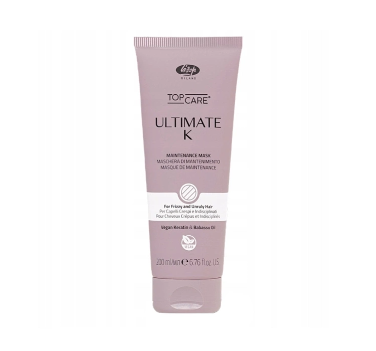 Lisap Milano Top Care Ultimate-K - маска, створена для волосся, яке потребує інтенсивного розгладжування та зволоження. Формула, збагачена веганським кератином, відновлює структуру пасм, зміцнюючи їх і надаючи їм шовковистої гладкості. Косметичний засіб не тільки зберігає випрямляючий ефект, але й полегшує укладку, усуваючи проблему кучерявості та елекризації.
