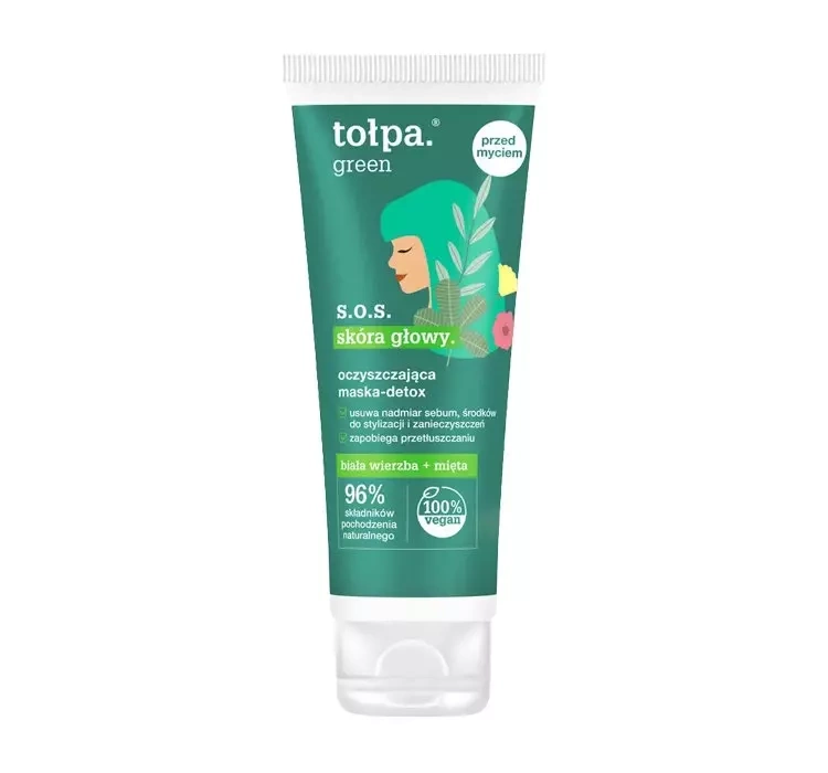 Очищаюча маска для шкіри голови і волосся tołpa green s.o.s. skóra głowy. завдяки своїй багатій формулі усуває забруднення, себум, ороговілий епідерміс і будь-які засоби для укладки. До складу входить, зокрема, екстракт кори верби білої, саліцилова кислота, сік листя м'яти, глина і фруктовий оцет, завдяки чому продукт відмінно впливає на стан волосся і шкіри голови. Маска при контакті з водою перетворюється в ніжну пінку, яка ефективно відновлює правильний баланс шкіри голови. Більше того, протидіє надмірній жирності пасм, завдяки чому зменшує частоту миття голови. Маска при регулярному застосуванні зміцнить чутливу шкіру голови і захистить її від негативного впливу зовнішніх чинників, а волоссю забезпечить гарний природний блиск і свіжість.
