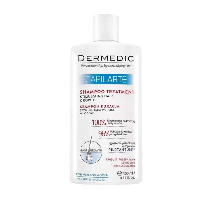 Шампунь Dermedic Capilarte призначений для людей, які страждають від періодичного або хронічного випадання волосся. Засіб ефективно запобігає надмірному випаданню волосся і стимулює його ріст. У своїй формулі він містить спеціально підібрані активні інгредієнти, в т.ч. Прокапіл, комплекс Pilotantum ™ або кофеїн, які пригнічують вироблення гормону дигідрокситестостерону (ДГТ), відповідального за випадання волосся. Крім того, шампунь покращує мікроциркуляцію в епідермісі, завдяки чому необхідна кількість вітамінів і живильних речовин надходить до клітин волосяного фолікула. Крім того, гліцерин і D-Пантенол надають волоссю блиск, згладжують, а також сприяють розчісуванню. Продукт є гіпоалергенним, трихологічно перевіреним.