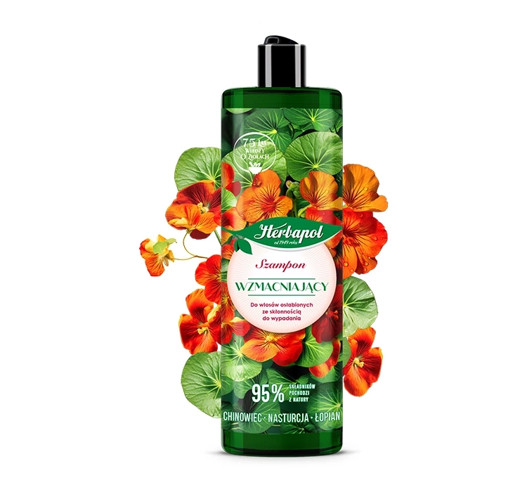 Зміцнюючий шампунь Хінне дерево & Настурція & Лопух Herbapol є веганським. Додатковою перевагою є приємний аромат.
