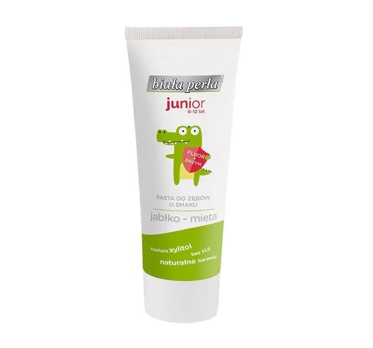 Biała Perła® JUNIOR - це делікатна зубна паста для дітей у віці 6-12 років. Яблучно-м'ятна ароматизована паста сподобається всім дітям. Ретельно чистить молочні зуби, зміцнює ясна і повністю безпечна для дітей.