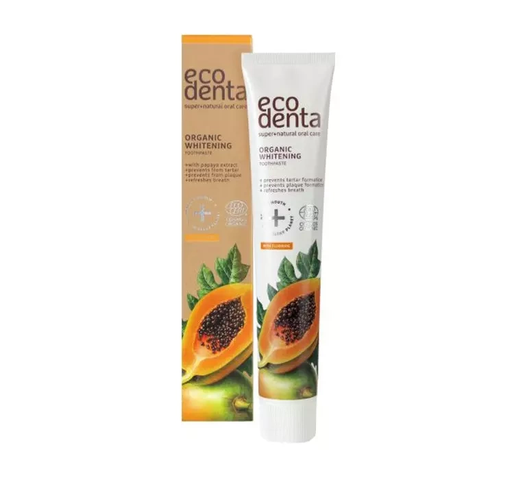 До складу екологічної зубної пасти входить екстракт органічної папаї, який ефективно, але водночас делікатно відбілює зуби. Протидіє утворенню зубного каменю, спричиненого питтям кави, чаю чи курінням тютюнових виробів. Фтор, що міститься в пасті марки Ecodenta, захищає зуби від карієсу та підвищує їх стійкість до дії кислого середовища в ротовій порожнині. Формула зубної пасти збагачена також ксилітом, що ремінералізує емаль. Додатковою перевагою продукту є його приємний фруктовий смак, який зробить повсякденну гігієну порожнини рота приємнішою.