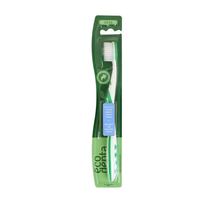 Зубна щітка Ecodenta має ергономічну ручку, яка добре адаптується до форми руки. Покрита спеціальним гумовим матеріалом. Щетина м’яка і щільна. Ідеально очищає міжзубні проміжки та видаляє бактеріальний наліт. Дістається до кожного закутка і щілини, не подразнюючи ясна. Делікатно і ретельно видаляє бактерії, що викликають неприємний запах з рота.