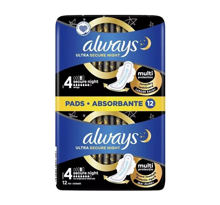 Гігієнічні прокладки Always Ultra 4 Secure Night із крильцями розроблені для захисту від протікання протягом ночі, мають на 60% більшу задню частину, ніж Ultra Normal. Вони забезпечують максимальний захист навіть під час сильної менструації.