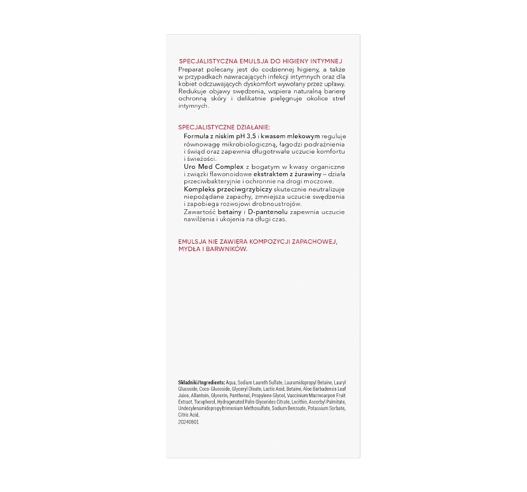Завдяки ретельно підібраним активним інгредієнтам, емульсія забезпечує належний догляд. Формула з низьким pH 3,5 допомагає відновити природне кисле середовище інтимних зон, знижуючи ризик повторних інтимних інфекцій.