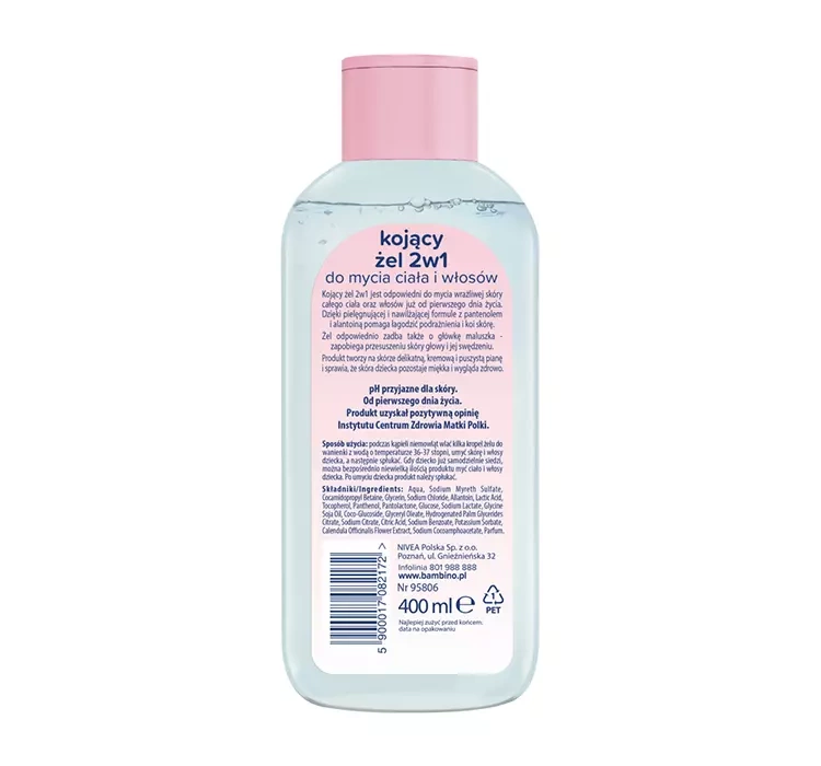 Заспокійливий гель Bambino не тільки помітно покращує стан дитячої шкіри, але також значно поліпшує її вигляд. Він утворює дуже ніжну піну на шкірі з сильними зволожуючими властивостями. Продукт не подразнює очі, що є дуже важливою перевагою миючих засобів для найменших діток.