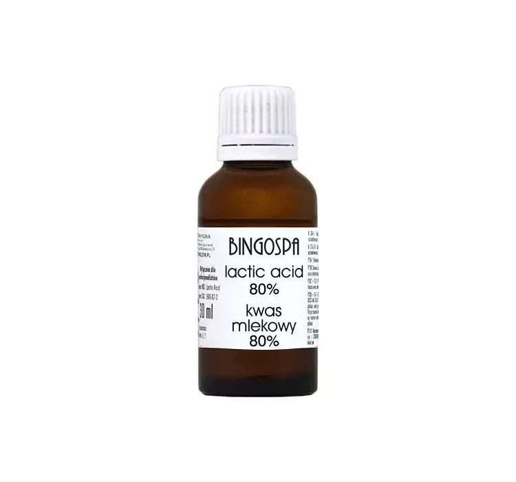 Молочна кислота 80% марки BingoSpa глибоко зволожує і нормалізує процеси відлущення епідермісу, а також стимулює синтез керамідів і колагену, таким чином ефективно гальмує передчасне старіння шкіри. Зменшує дрібні зморшки і покращує пружність та еластичність шкіри. Більше того, ідеально очищає шкіру від мертвого епідермісу та значно розгладжує її і вирівнює колір. Молочна кислота також регулює виділення шкірного сала і протидіє запаленням.