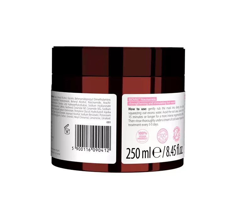 Маска для волосся із серії Biovax Niacinamide має веганську рецептуру - не містить інгредієнтів тваринного походження, тому буде безпечним вибором для веганів і вегетаріанців.