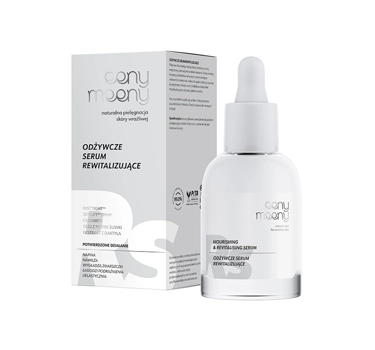Натуральна формула сироватки eeny meeny Nourishing & Revitalizing Serum наповнена продуманим складом активних інгредієнтів, які мають антивікові властивості. Вони ефективно захищають шкіру від вільних радикалів, надаючи їй молодості та еластичності. Варто згадати деякі з них, такі як: екстракт насіння акації INST'TIGHT ™, екстракт фініків PLANTID ™ DACTYL EXTRACT, олія кісточок сливи, амінокислота. SEPILIFT™ DPHP містить колаген, активний керамід CERAFLUID, низькомолекулярний гідролізований гіалуронат натрію та рослинний сквалан.