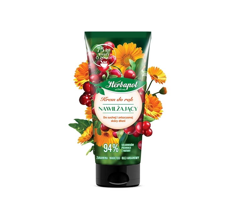 Крем для сухої та пошкодженої шкіри рук Herbapol Polana Cranberry & Calendula & Argan oil є веганським і містить аж 94% інгредієнтів натурального походження. Він пройшов дерматологічне тестування, а його ефективність підтверджена дослідженнями.