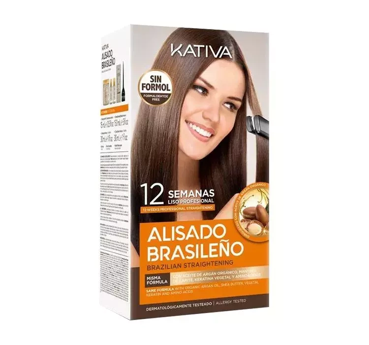Професійний набір для кератинового випрямлення волосся Kativa Alisado Brasileño усуває проблему пухнастості та електризації. Відновлює волосся, що є не схильне до укладання та пошкоджене хімічними процедурами або зовнішніми факторами.