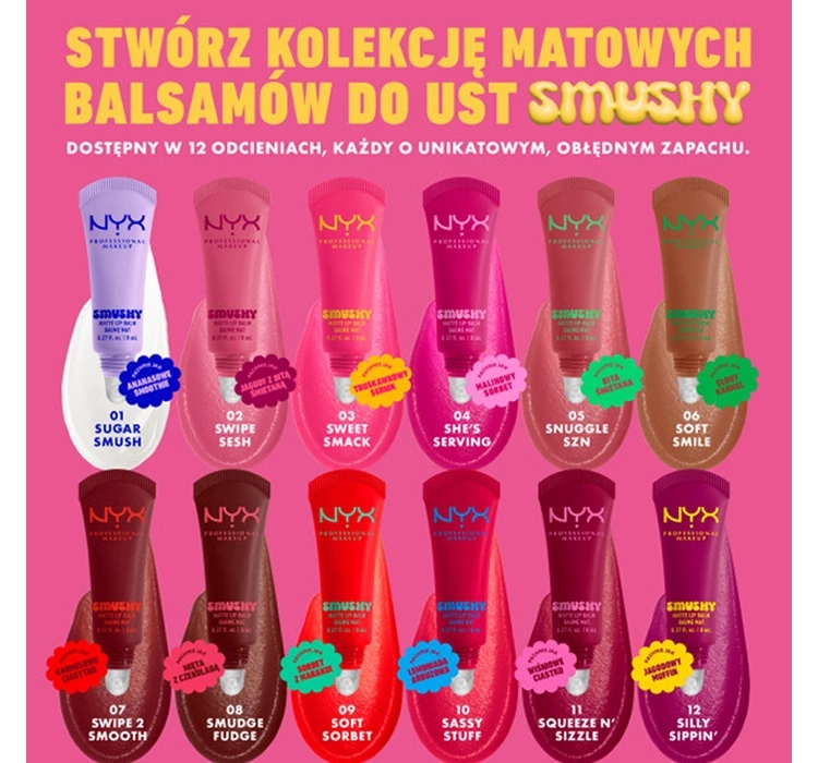 NYX Professional Makeup Smushy Matte Lip Balm — це унікальний бальзам для губ, який поєднує модний матовий фініш з глибоким доглядом. М’яка, оксамитова текстура надає губам природного та гламурного вигляду, красиво підкреслюючи їхню форму. Матовий бальзам для губ NYX Smushy дозволяє досягти як ніжного, повсякденного ефекту, так і більш інтенсивного кольору, який привертає увагу.