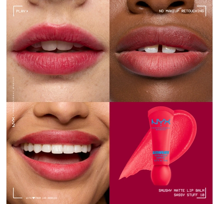 Формула бальзаму для губ NYX Smushy Matte Lip Balm збагачена маслом ши, яке глибоко зволожує і відновлює губи, і керамідами, що підтримують захисний бар'єр шкіри. Бальзам легко наноситься, огортаючи губи м’яким, матовим кольором, а інноваційна рисова пудра моті додатково закріплює ефект, забезпечуючи комфортне носіння протягом усього дня. Регулювання інтенсивності кольору дозволяє підлаштувати макіяж губ відповідно до своїх уподобань.