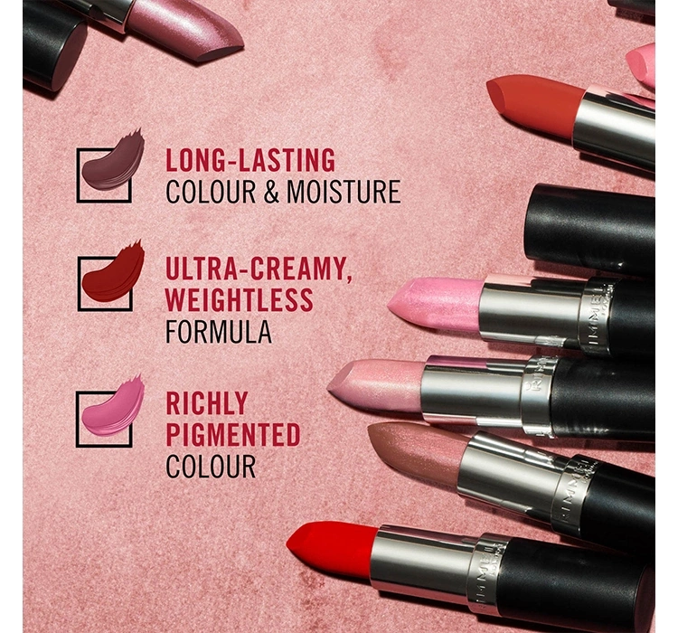 Rimmel Lasting Finish Satin Lipstick — це кремова і стійка помада з атласним фінішем. Всього один рух губної помади забезпечує інтенсивний колір і миттєве зволоження, яке зберігається протягом усього дня, забезпечуючи комфорт носіння. Для ідеального вигляду губ поєднайте помаду з олівцем для губ Rimmel Lasting Finish.