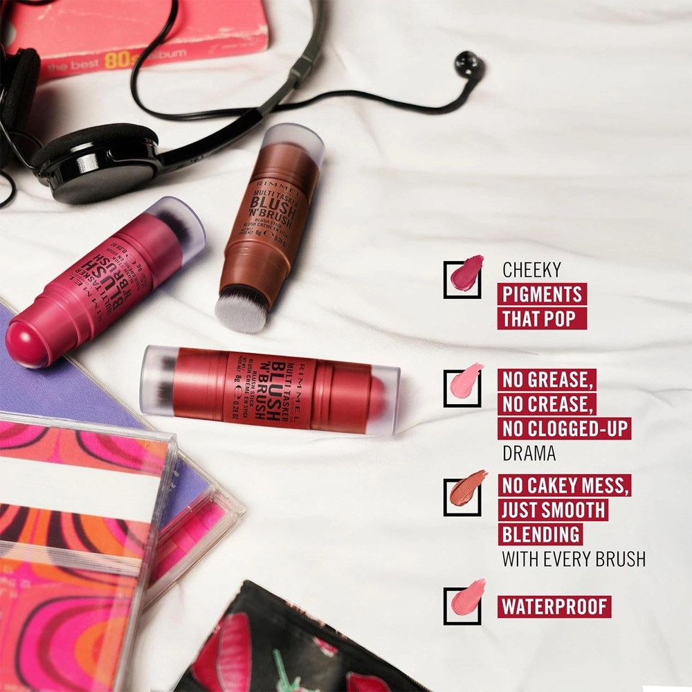 Формула Rimmel Multi Tasker Blush 'N' Brush базується на технології cream to powder, яка під час нанесення зберігає кремову м’якість, а після розподілення переходить у ніжне пудрове покриття. Рум’яна Multi Tasker Blush 'N' Brush рівномірно зливаються зі шкірою, не обтяжують її та не підкреслюють сухі ділянки. Водостійка консистенція забезпечує стійкість протягом багатьох годин без ефекту розмазування чи втрати інтенсивності.
