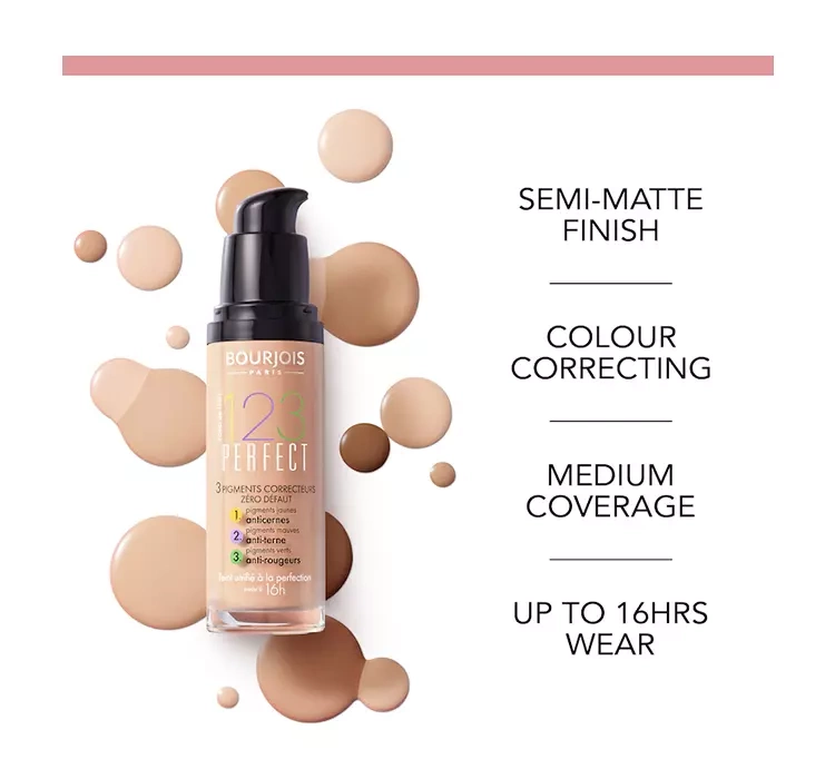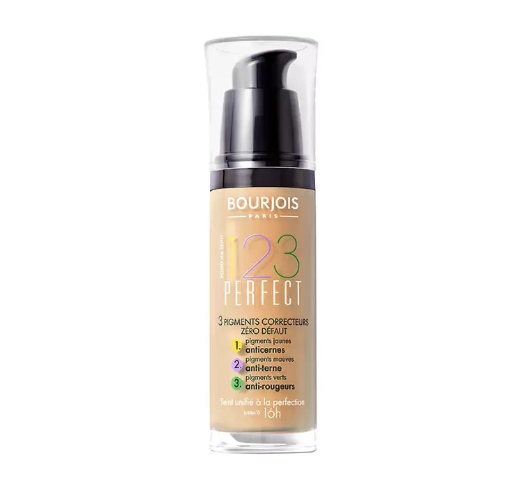 Тональний засіб Bourjois 123 Perfect приховує 100% недоліків, завдяки своїй унікальній формулі, яка поєднує 3 пігменти: жовті -борються з темними колами під очима, фіолетові - додають шкірі блиску, а зелені - приховують почервоніння.