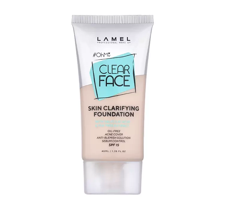 Матуючий тональний засіб Clear Face Skin Clarifying Foundation Lamel має легку нежирну формулу, яка не обтяжує шкіру. Тональний засіб забезпечує оновлений вигляд навіть для проблемної, вимогливої шкіри або шкіри, схильної до вугрів. Засіб не забиває пори і не підкреслює суху шкіру. Тональний крем для обличчя Clear Face Lamel містить протизапальну та дезінфікуючу олію чайного листя та саліцилову кислоту. Завдяки такому поєднанню кремоподібний продукт чудово зливається з обличчям, вирівнює його колір і зменшує видимість будь-яких недоліків. Ви можете використовувати тональний засіб щодня, оскільки він містить захисний фільтр SPF 15, який захищає обличчя від негативного впливу UVA та UVB випромінювання.
