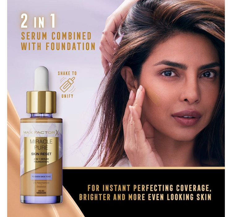 Тональний засіб для обличчя Max Factor Miracle Pure Skin Reset 2-in-1 Serum Foundation містить два ключових активних інгредієнти: бісаболол і ніацинамід, які позитивно впливають на зовнішній вигляд і стан шкіри. Бісаболол підтримує природний рівень зволоження шкіри, має заспокійливу дію, зменшуючи подразнення та почервоніння. Тоді як ніацинамід (вітамін B3) допомагає освітлити зміни кольору та нерівний тон шкіри, що сприяє досягненню рівномірного вигляду кольору обличчя.