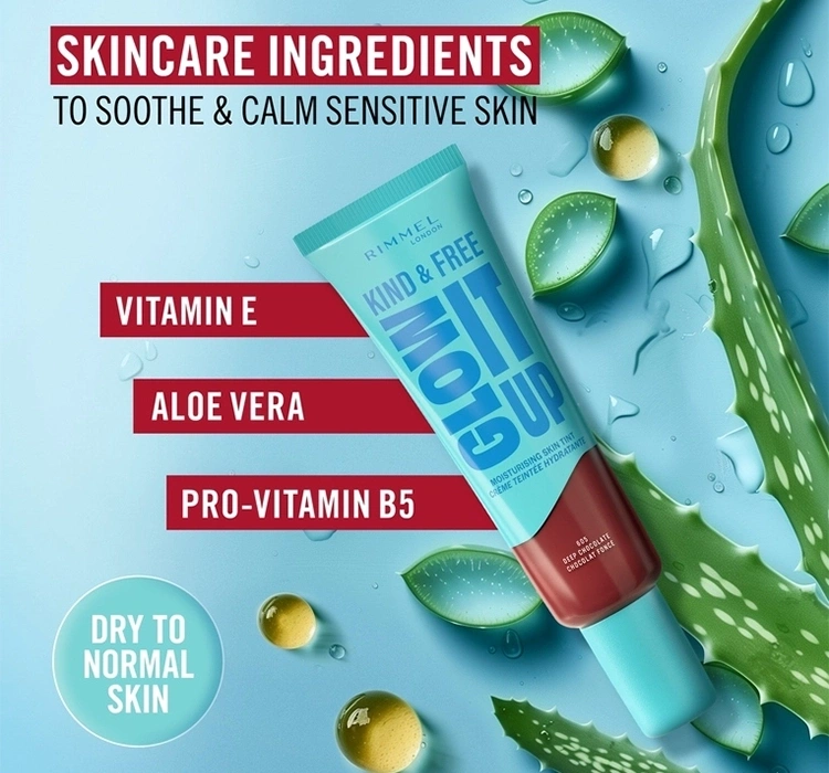 Rimmel Kind & Free Glow It Up Moisturizing Skin Tint — це легкий зволожуючий тональний засіб, який поєднує в собі догляд із рівним покриттям, надаючи шкірі природного здорового сяйва. Створений для чутливої, нормальної та сухої шкіри, чудово заспокоює та зволожує завдяки наявності антиоксидантного комплексу, що містить вітамін Е, провітамін В5 та алое.