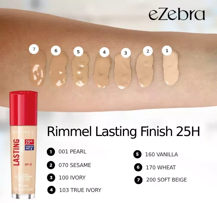 Rimmel Lasting Finish утримується до 25 годин з моменту нанесення, навіть при високій вологості та значних температурах. Сироватка, що міститься у формулі, забезпечує миттєве зволоження, а вітамін Е захищає шкіру від вільних радикалів. Крім того, косметичний засіб має фільтр SPF 20, який захищає від шкідливого впливу зовнішніх факторів.
