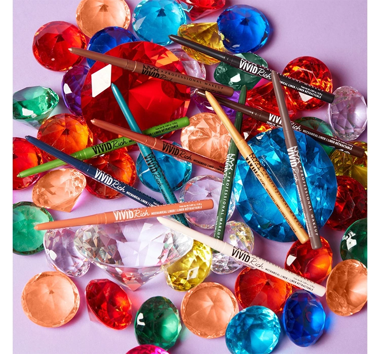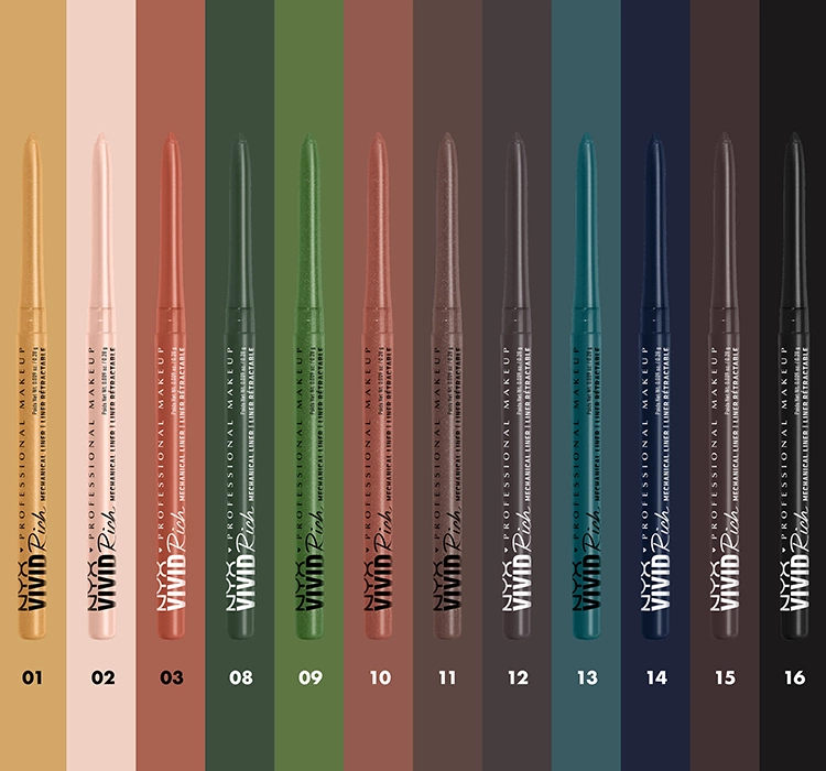 NYX Professional Makeup Vivid Rich Mechanical Pencil - це серія автоматичних підводок для очей у 12 кольорах, натхненних дорогоцінним камінням - золота, перлів, смарагду, аквамарину і т.д. Широка гама надзвичайно насичених відтінків підходить до будь-якого відтінку обличчя та шкіри. Серія Vivid Rich пропонує необмежені можливості для створення макіяжу для будь-якого випадку.