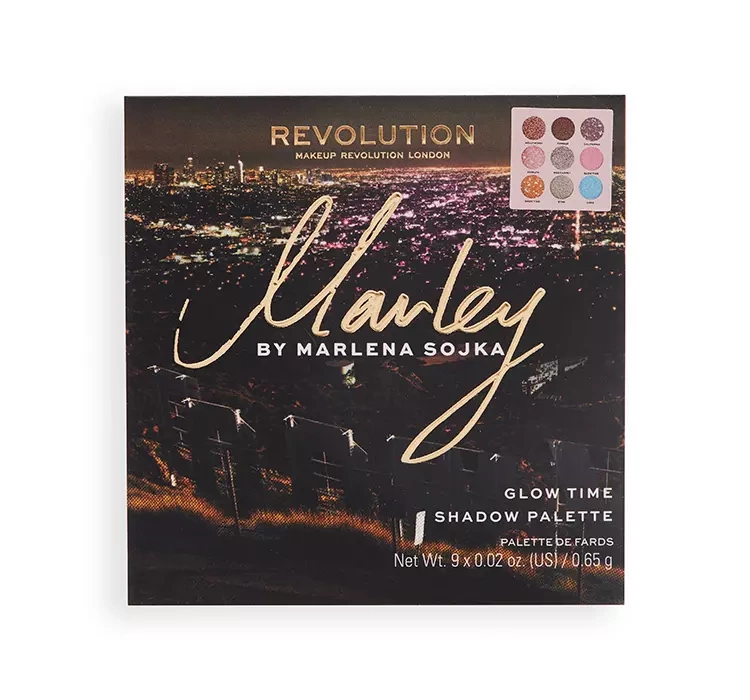 Палітра тіней для повік Glow Time із серії Makeup Revolution x Marley by Marlena Sójka містить 9 високопігментованих тіней для повік із блискучим фінішом.