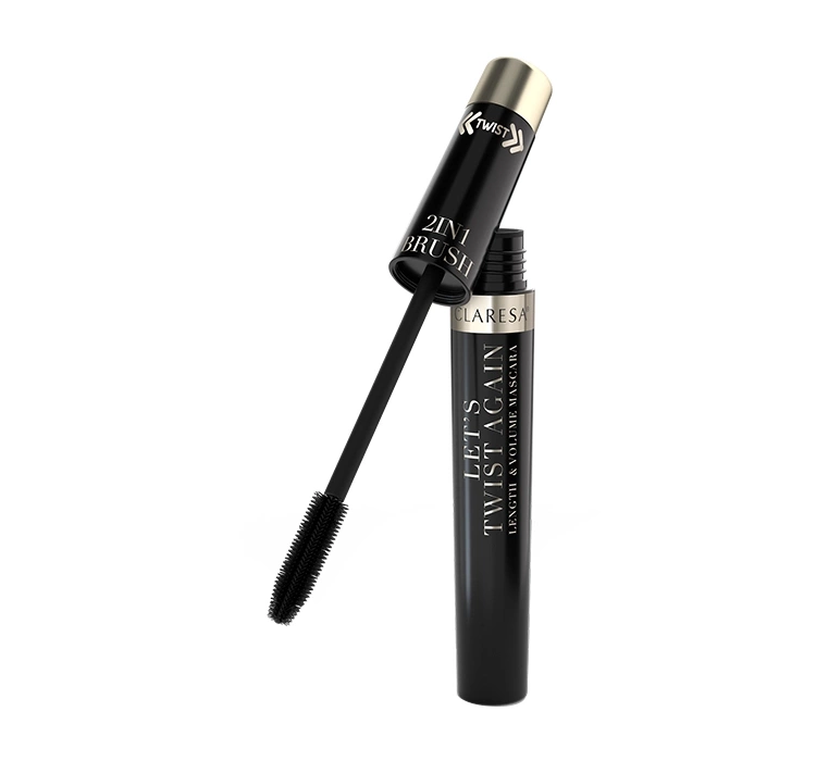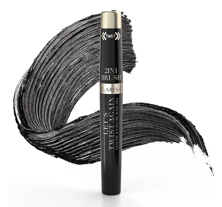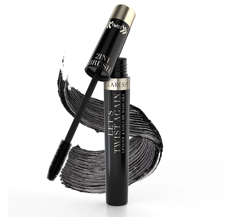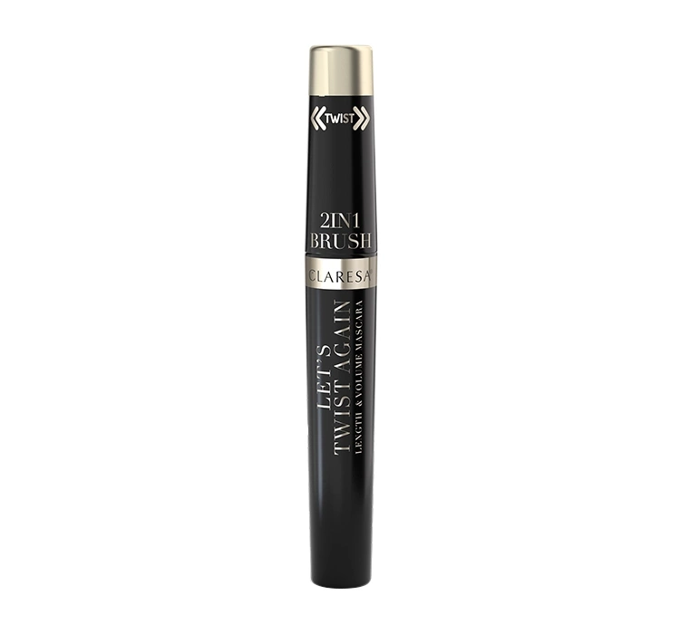 Claresa Let's Twist Again — це інноваційна туш для вій 2в1, що поєднує подовження й об’єм в одному продукті. Завдяки обертовій щіточці Twist Mascara можна отримати два різні ефекти: класичне положення щетинок подовжує вії та підкреслює погляд, а після скручування щіточка надає об’єму, насиченого чорного кольору та помітного підкручування. Маскара Claresa дозволяє наносити кілька шарів без грудочок, забезпечуючи густі, виразно розділені вії.