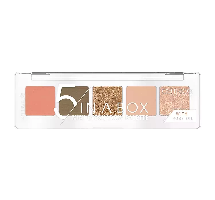 Палетка тіней Catrice 5 In A Box — косметичний засіб, створений з думкою про любителів подорожей. Невеликий розмір виробу легко поміститься в будь-яку косметичку або сумочку, тому тепер Ви зможете попіклуватися про свій зовнішній вигляд в будь яких обставинах. Палетка включає 5 тіней з матовим і сатиновим покриттям, які ідеально поєднуються між собою. Сильно пігментована формула залишає на повіці інтенсивний колір, нанесений лише одним рухом, який триматиметься на повіці протягом тривалого часу. Крім того, склад тіней збагачено трояндовою олією, яка не тільки доглядає за ніжною шкірою повік, але й робить тіні надзвичайно м'якими та приємними у нанесенні.