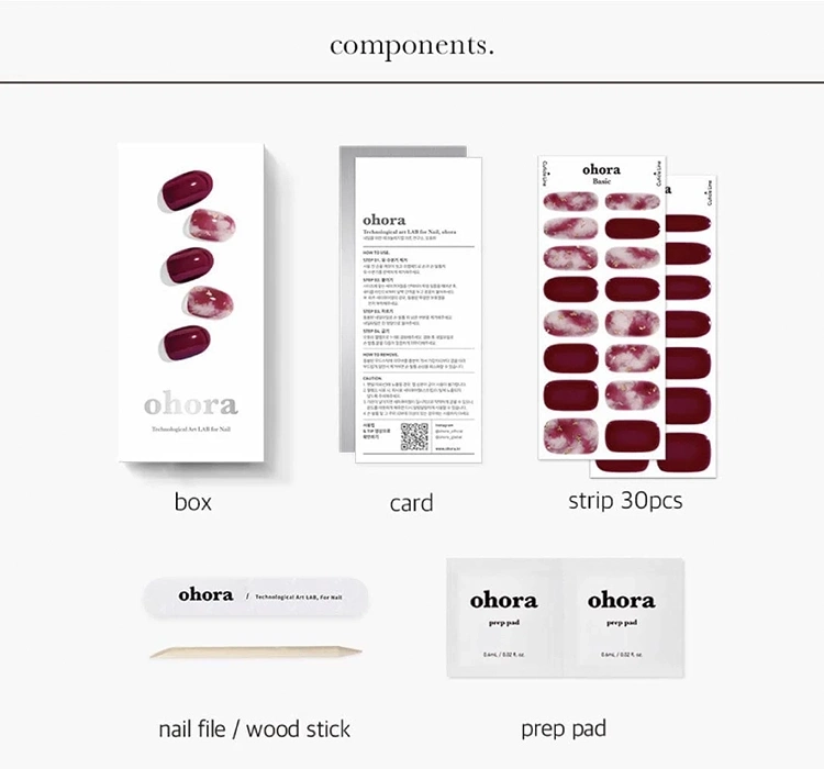 Південна КореяВиконання манікюру і педикюру за допомогою гель-лаків, незважаючи на свою стійкість, це довгий та трудомісткий процес. Бренд Ohora поставив собі за мету скоротити час, необхідний для професійного фарбування нігтів, зберігаючи при цьому стійкість і естетичність. Так виникли гелеві наклейки для нігтів, які є запорукою красивого манікюру, економії часу та здоров'я нігтьової пластини. Гелеві наклейки для нігтів Ohora - це три шари традиційного на 60% затверділого гель-лаку для нігтів. Завдяки цьому наклейки ідеально пасуватимуть до різних форм і розмірів нігтьової пластини.