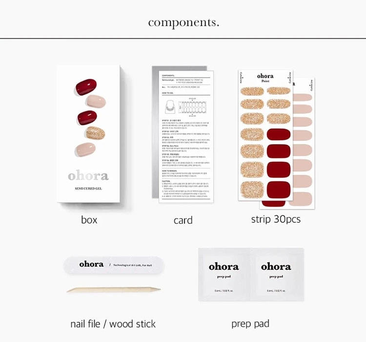 Південна КореяВиконання манікюру і педикюру за допомогою гель-лаків, незважаючи на свою стійкість, це довгий та трудомісткий процес. Бренд Ohora поставив собі за мету скоротити час, необхідний для професійного фарбування нігтів, зберігаючи при цьому стійкість і естетичність. Так виникли гелеві наклейки для нігтів, які є запорукою красивого манікюру, економії часу та здоров'я нігтьової пластини. Гелеві наклейки для нігтів Ohora - це три шари традиційного на 60% затверділого гель-лаку для нігтів. Завдяки цьому наклейки ідеально пасуватимуть до різних форм і розмірів нігтьової пластини.