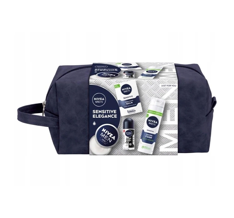 Подарунковий набір Nivea Men Sensitive Elegance - це ідеальний вибыр для чоловіків з чутливою шкірою, забезпечуючи комплексний догляд і захист. У набір входить елегантна косметичка і заспокійливий бальзам після гоління, який заспокоює подразнення і зволожує шкіру, заспокійлива піна для гоління, яка гарантує комфортне і гладке гоління, а також крем для тіла, обличчя та рук, який інтенсивно зволожує та захищає шкіру від сухості. Набір доповнено роликовим антиперспірантом Nivea Men Black & White, який забезпечує тривалий захист від поту та плям, не залишаючи слідів на одязі.